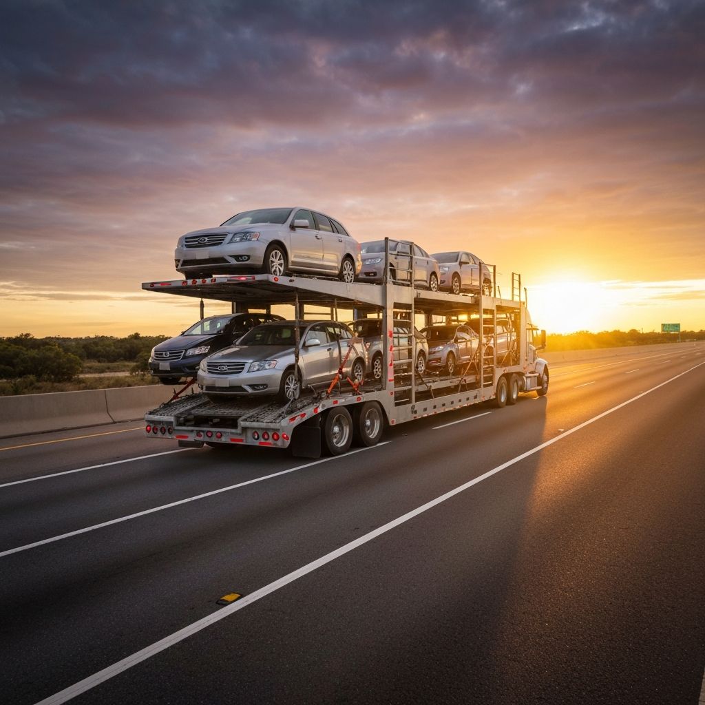 The carrier holds 7-10 vehicles on two levels, each professionally secured with soft-touch wheel straps and tire nets. Because the cost is shared across multiple vehicles, the per-car price is significantly lower than enclosed transport. Open shipping is recommended for sedans, SUVs, trucks, minivans, and any vehicle under $75,000 in value.