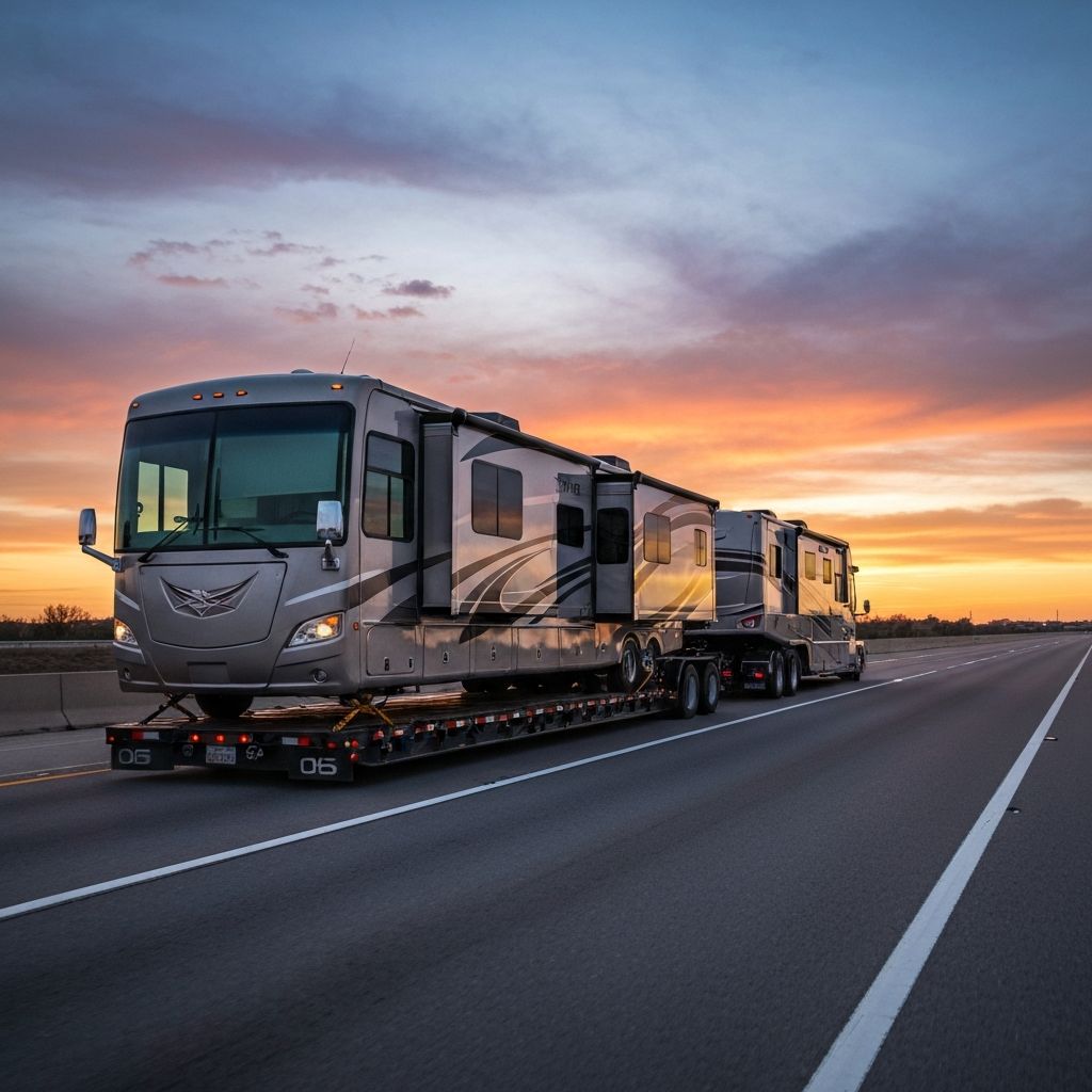 FMCSA licensed, oversize permits, escort vehicles, and $1M+ cargo insurance for RV transport.